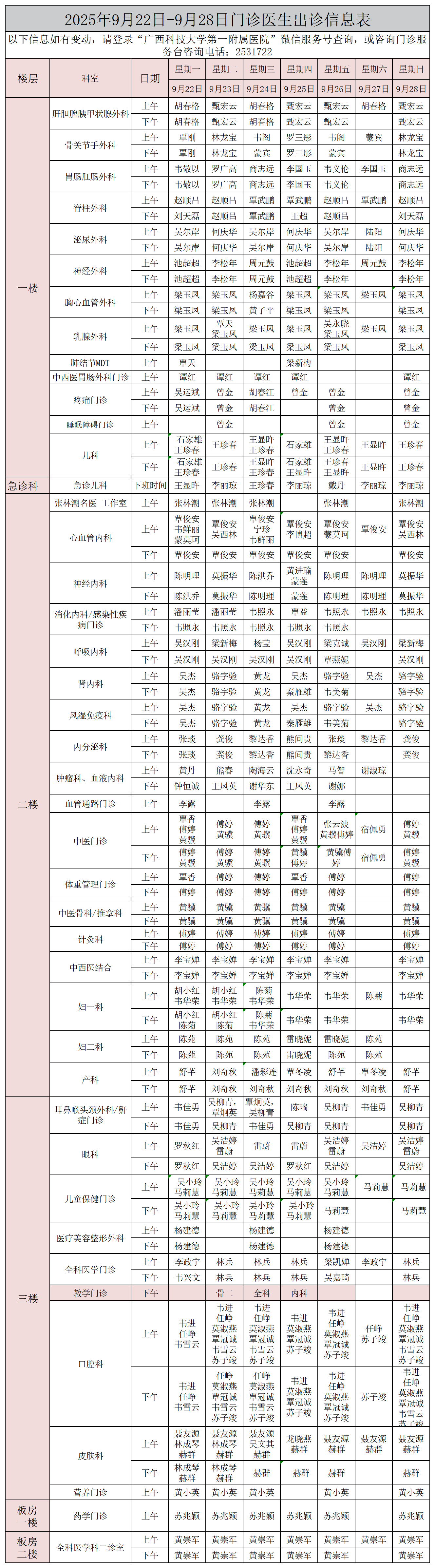 【门诊信息】2025年9月22日-9月28日出诊安排