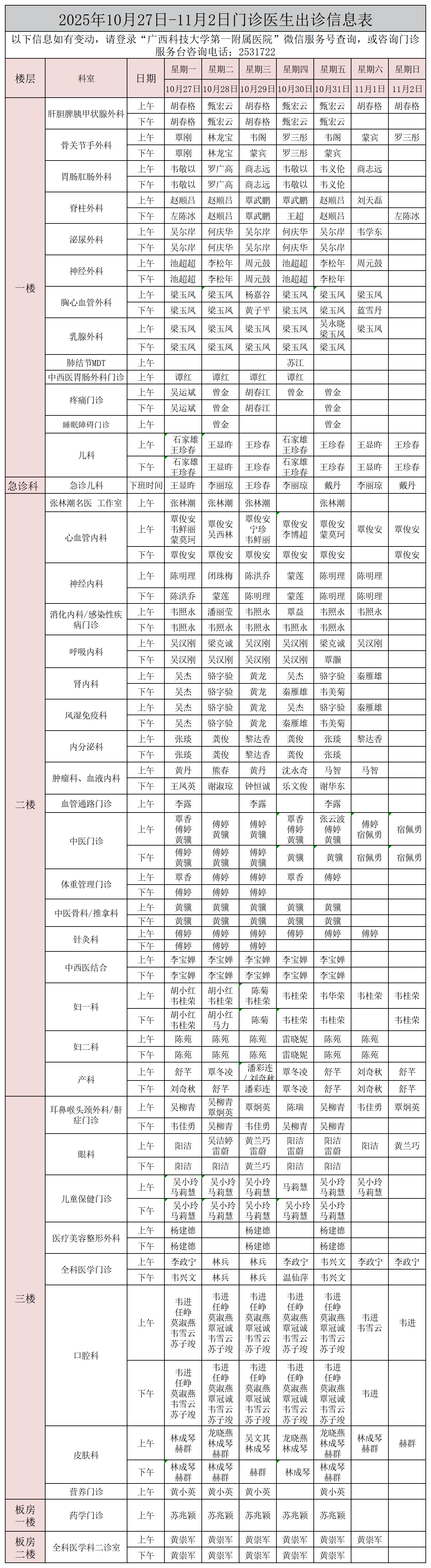 门诊信息 | 2025年10月27日-11月2日出诊信息表