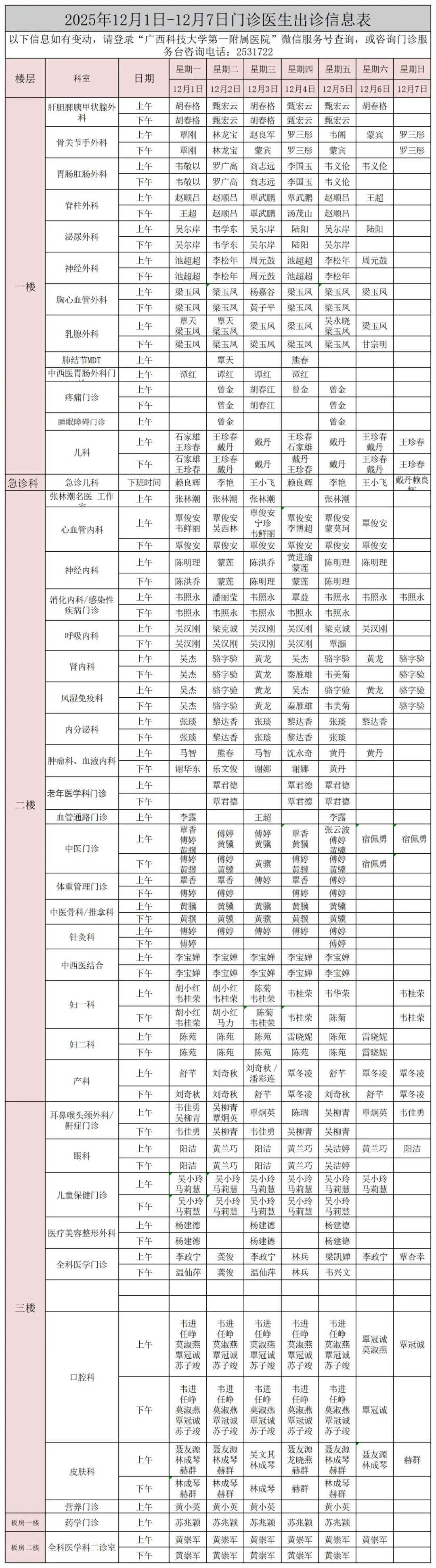 门诊信息 | 2025年12月1日-12月7日门诊医生出诊信息表
