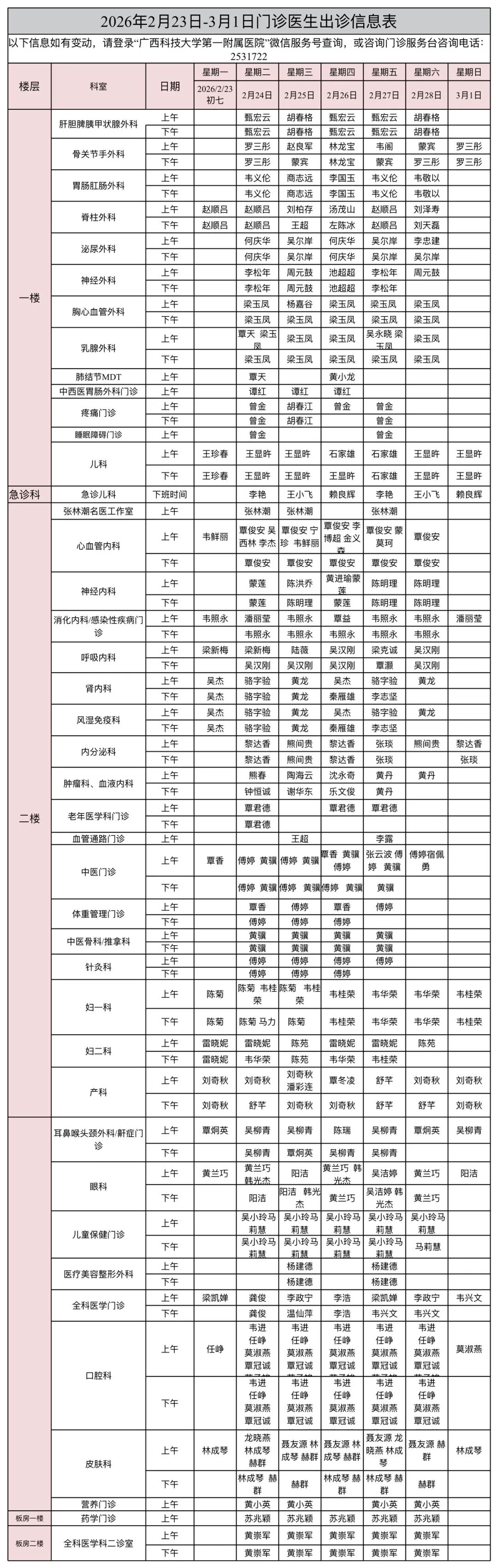 门诊信息 | 2026年2月23日-3月1日出诊信息表