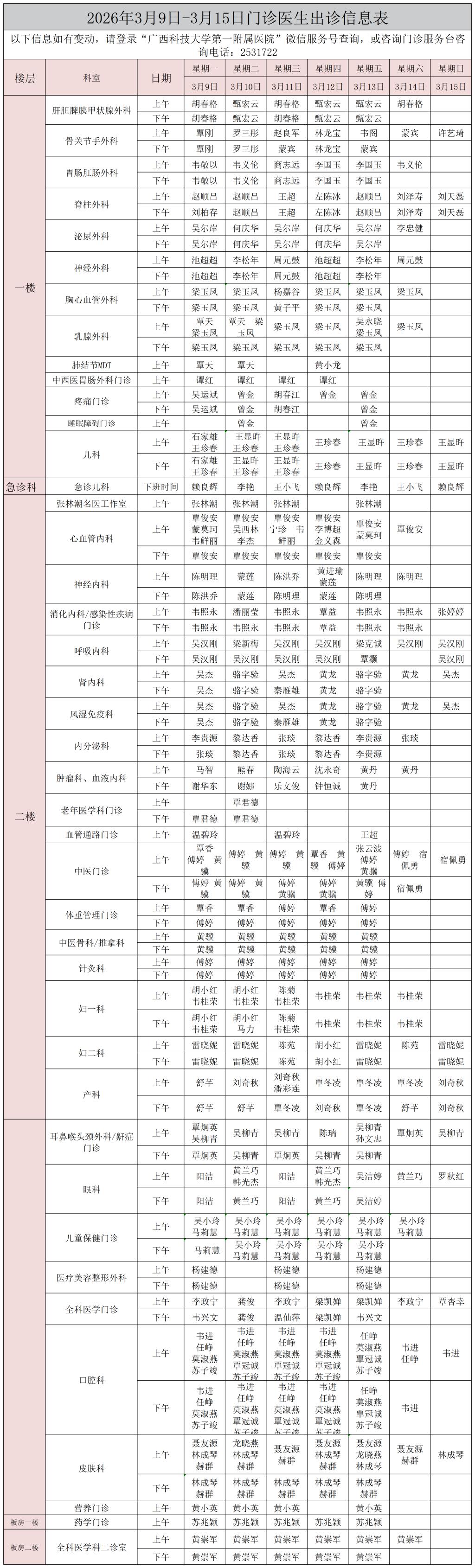 门诊信息 | 2025年3月9日-3月15日出诊信息表