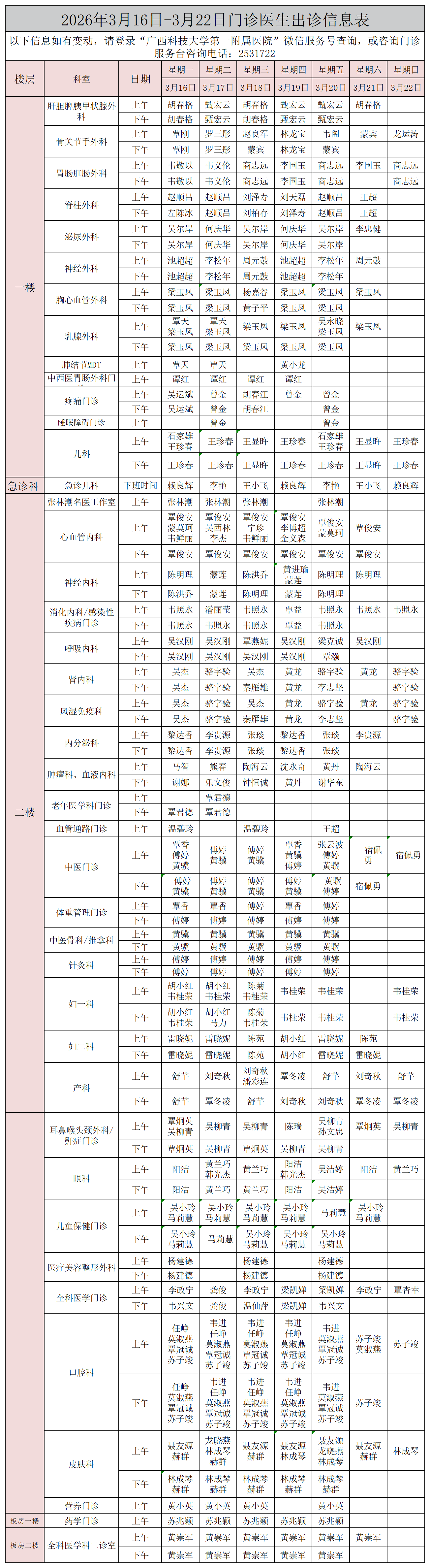 门诊信息 | 2026年3月16日-3月22日出诊信息表