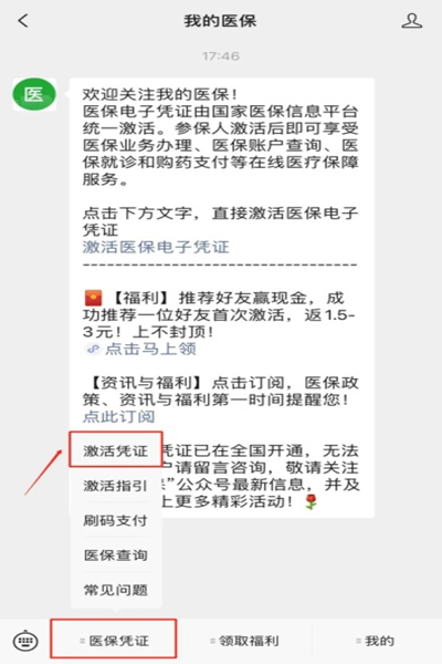 通过微信激活。微信搜索“我的医保”微信号,点击“医保凭证-激活凭证”,根据指引完成身份验证并“授权激活”,通过人脸识别核实身份后,即可成功激活。