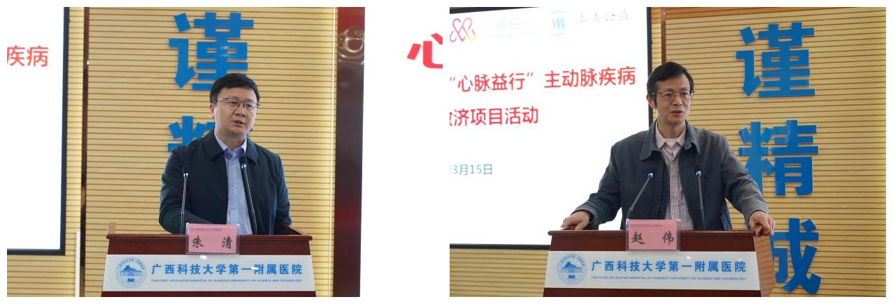 仪式伊始,”心脉益行"主动脉疾病贫困患者救济专项基金管理委员会主任朱清先生在签约仪式上致辞。他介绍了“心脉益行”项目的背景与意义,并表示主动脉疾病是一种严重威胁患者生命的疾病,许多贫困患者因经济困难无法得到及时治疗。“心脉益行“项目先后与全国20多家医院合作并成功救助了家庭经济困难的主动脉疾病患者130余人,而广西科技大学第一附属医院是目前救济患者人数较多的医院之一。随后,上海上善公益基金会秘书长赵伟发言,他向与会人员介绍了上善基金会的简要情况,并对“心脉益行"项目设立以来,广西科技大学第一附属医院领导、各科专家以及志愿者的爱心关注、支持和参与,尤其是胸心血管外科医护人员在对接和服务病患过程中做出的努力表达了感谢。他提出,希望通过“心脉益行"项目搭建起一个关爱主动脉疾病患者的平台,在进行一次性医疗费用救济和患者完成手术后,还能指导患者进行后续的康复和健康管理。