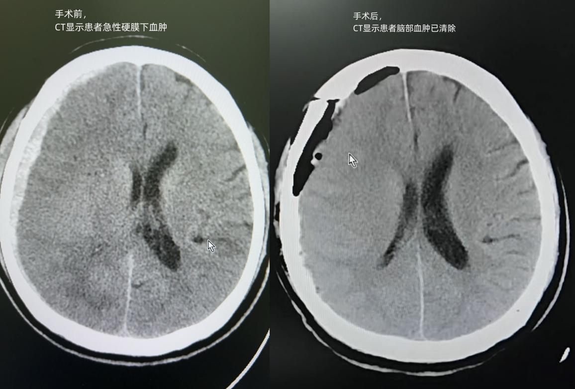 9时08分,经过初步处置的后,急救团队将患者送到CT检查,提示右侧额颞顶枕部急性硬膜下出血,这意味着患者颅内正在出血,形成巨大血肿压迫生命中枢,必须立即手术!