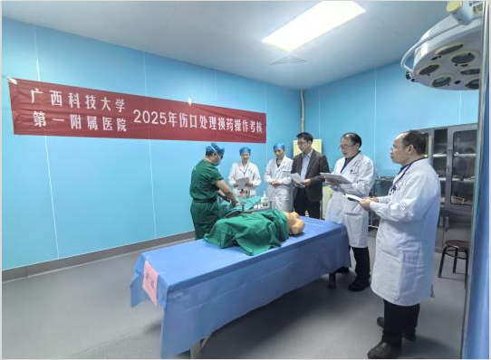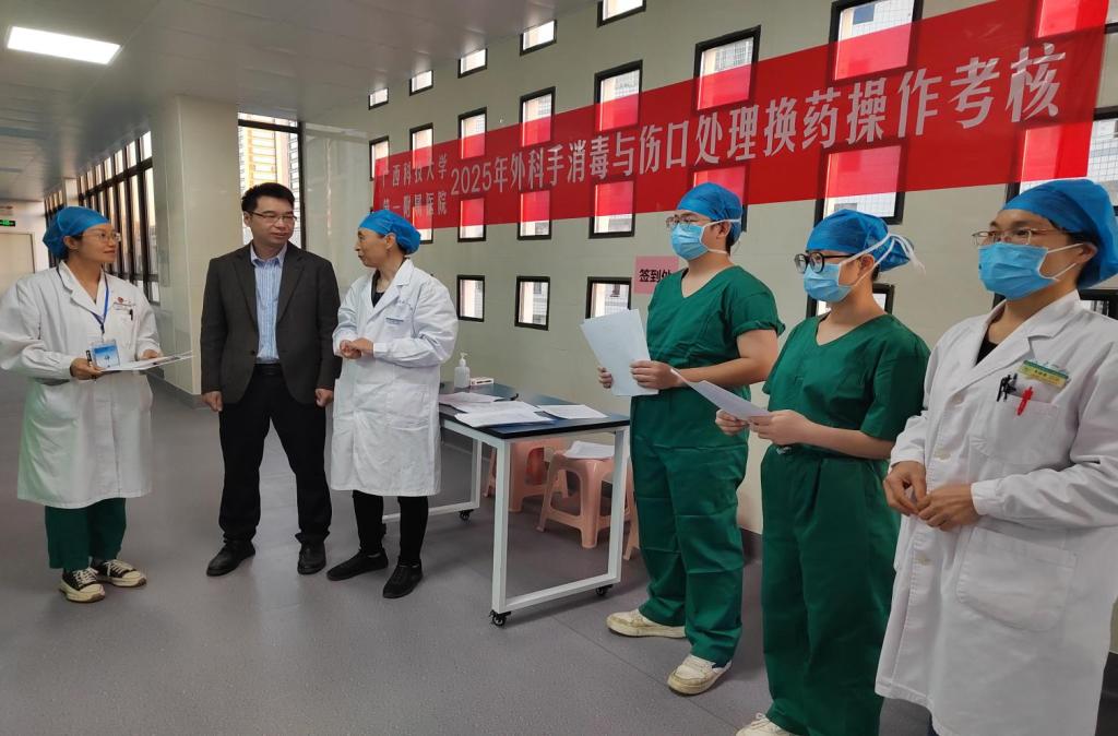 为保障手术质量安全,扎实落实“感术”专项行动要求,聚焦围术期重点环节,夯实感染防控措施。2025年11月12日—13日,广西科技大学第一附属医院开展外科手消毒与换药技能操作专项考核。医院副院长赵良军莅临现场指导专项考核。