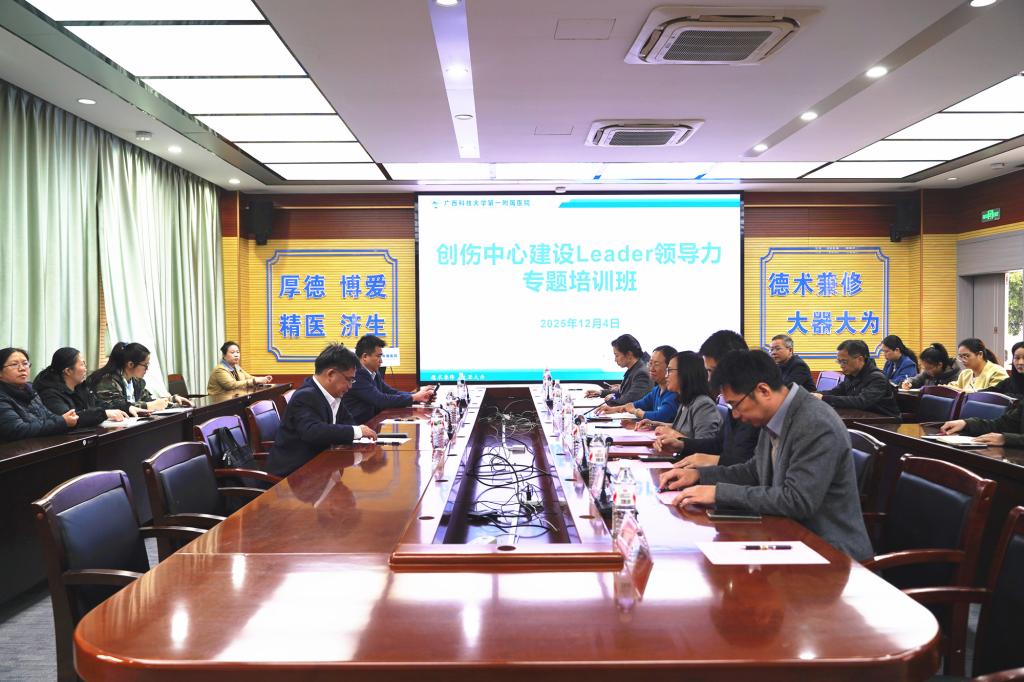 12月4日下午,广西科技大学第一附属医院在临床培训中心B栋一楼会议室举办创伤中心建设Leader领导力专题培训班。特邀广西医科大学第二附属医院院长韦庆军教授,柳州市工人医院胡居正教授进行专题授课。医院党委副书记、院长黄进瑜等全体在家院领导出席培训班。医院创伤中心核心科室医护人员及医务部、护理部负责人等50多人参加培训班。培训班由黄进瑜主持。