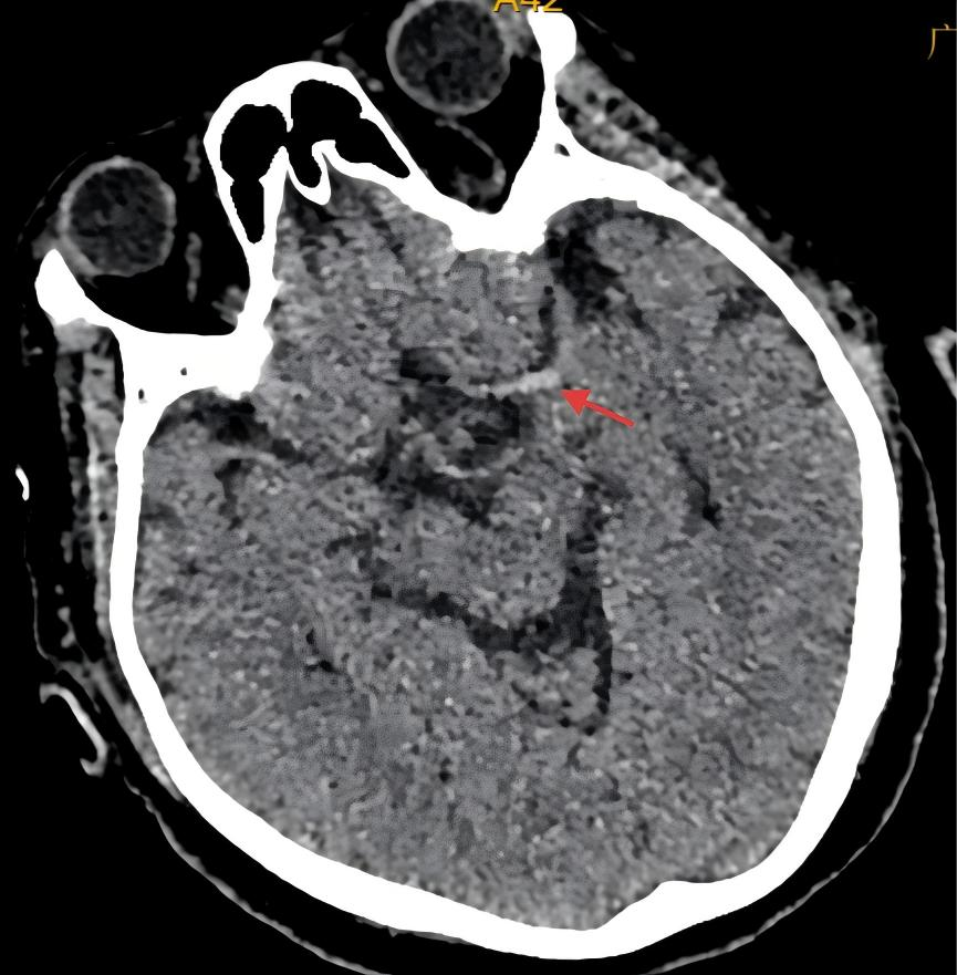 头颅CT提示左侧大脑中动脉高密度影(红色箭头)