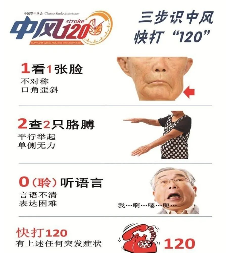 温馨提示:一旦出现突发一侧肢体麻木、无力,口角歪斜、言语含糊或理解障碍、视物模糊、眩晕、行走不稳、意识障碍等症状,请立即拨打120!