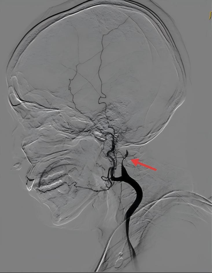 左侧颈内动脉闭塞(红色箭头)