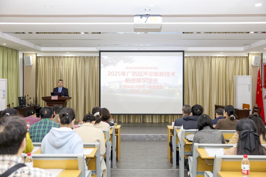 为加强超声医学领域学术交流,展示超声诊断新技术、新成果,提高超声医师诊疗水平,构建一个多元、开放、前沿的学术交流平台,推动超声学科创新发展,经广西继续医学教育委员会批准,广西科技大学第一附属医院于2025年12月20-21日在第一临床医学院党员活动室举办自治区级继续医学教育项目《2025年广西超声诊断新技术新进展学习班》,来自广西区内各医疗机构超声医师及相关学科医务人员100余人参加了本届学习班。医院党委委员、副院长银世杰出席开幕式并致辞。开幕式由我院超声医学科主任王高兴主持。
