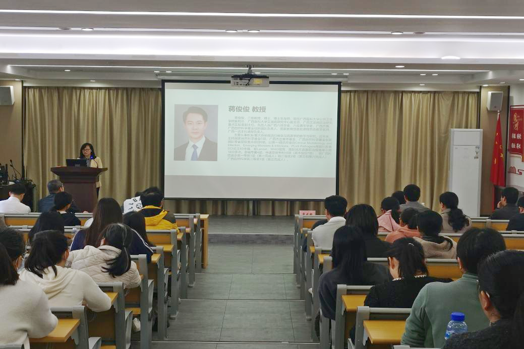 讲座伊始,黄进瑜院长对蒋俊俊教授作了介绍。蒋俊俊教授系广西医科大学公共卫生学院副院长、二级教授、博士生导师,兼任广西医科大学艾滋病研究中心副主任、广西艾滋病防治研究重点实验室副主任。其学术荣誉显著,先后入选广西八桂学者、八桂青年学者,获得广西杰出青年科学基金,担任广西自然科学基金创新团队负责人,并获评国家教育部首批课程思政教学名师、广西一流本科课程负责人。蒋教授长期深耕于新发/重大传染病流行病学与病原学研究,科研业绩突出:主持国家自然科学基金项目5项、省部级重点项目6项;以第一作者或通讯作者在 Clinical Microbiology and Infection、Emerging Microbes & Infections、PLoS Pathogens 等国际权威期刊发表SCI论文60余篇,研究成果被 The Lancet、WHO指南及国际防治指南引用1800余次;参编专著4部,申请发明专利18项(已授权7项),并获得广西科技进步奖一等奖1项、二等奖2项及广西自然科学奖二等奖1项。