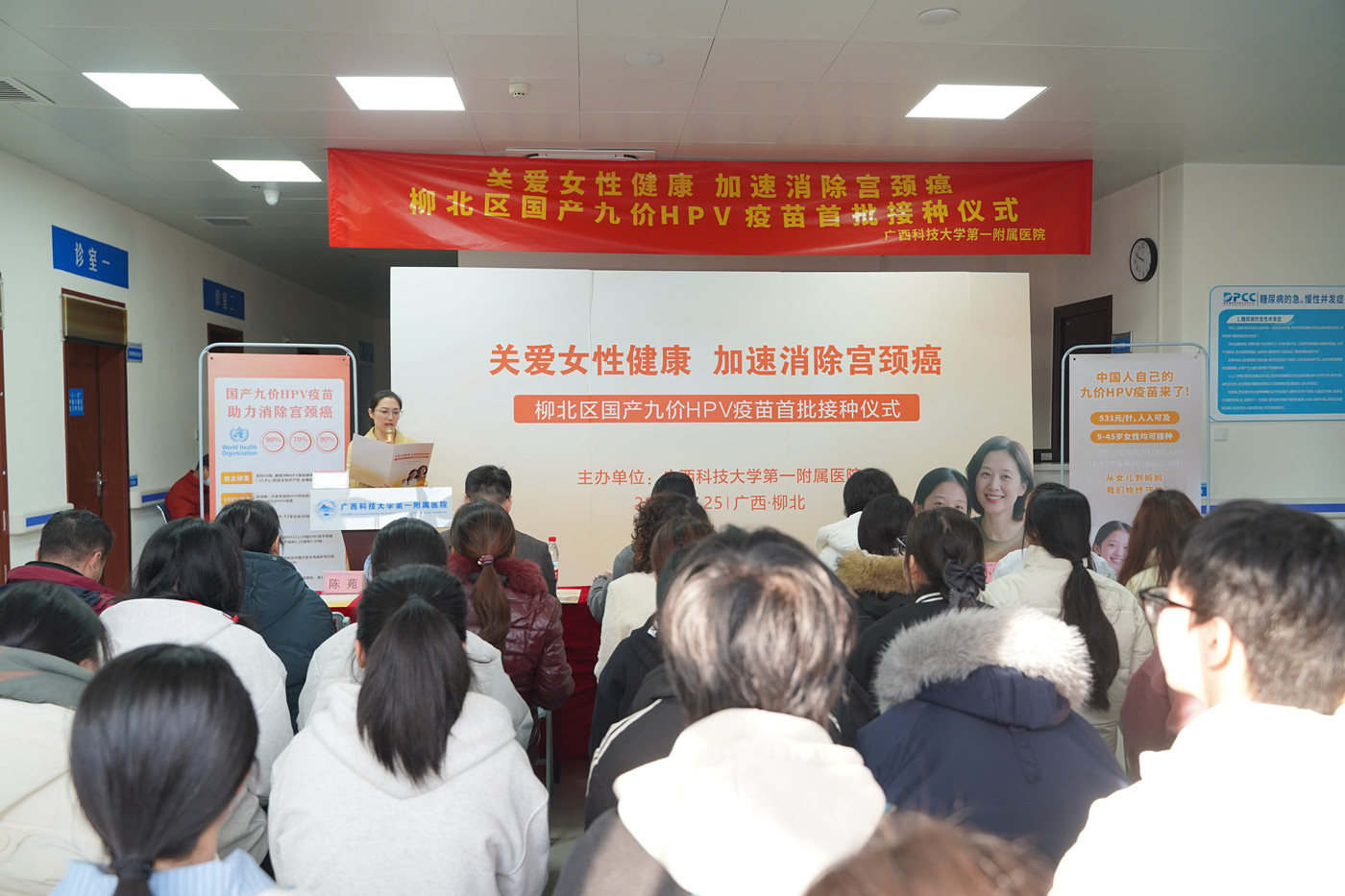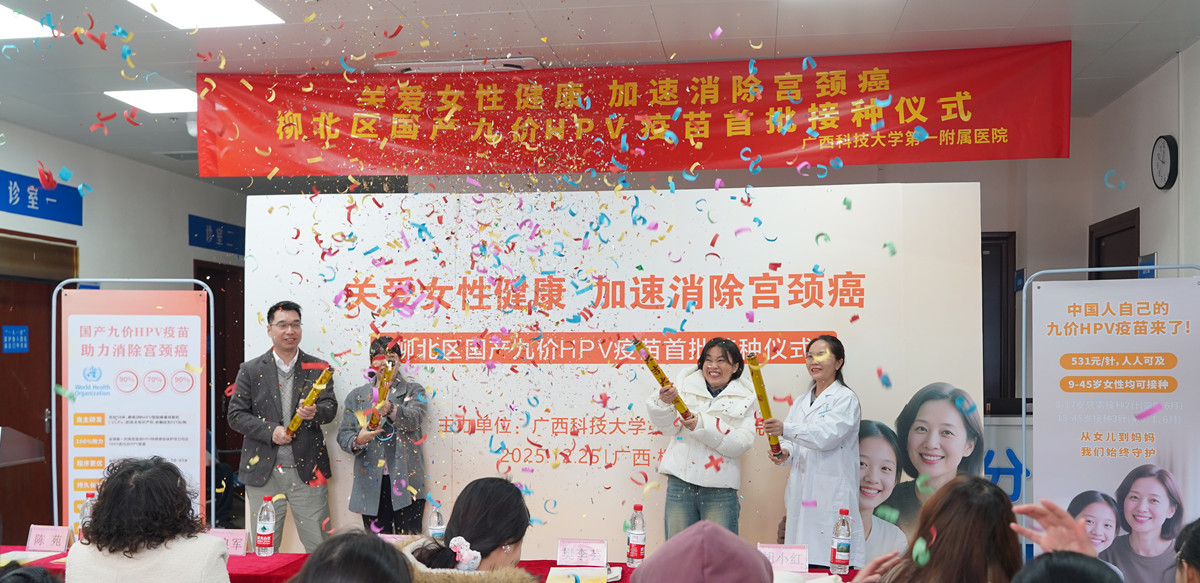 为积极响应国家加速消除宫颈癌行动计划,更好地守护我区女性的生命健康,12月25日上午10:00在广西科技大学第一附属医院举行“关爱女性健康,加速消除宫颈癌”柳北区国产九价HPV疫苗首批接种仪式。柳北区妇女联合会主席兰素石,广西科技大学第一附属医院党委委员、副院长赵良军出席仪式。柳北区胜利社区卫生服务中心、沙塘镇中心卫生院、长塘镇卫生院、友谊社区卫生服务中心等相关单位负责人参加仪式。仪式由医务部副部长陈苑主持。
