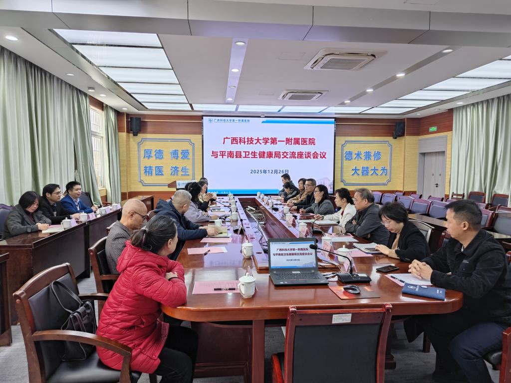 12月26日,平南县卫生健康局副局长刘紫丽带领辖区内平南县东华镇卫生院、平南康福医院领导班子成员及相关科室负责人等12人到访广西科技大学第一附属医院开展业务合作调研交流。此次交流旨在依托三级医院的优质资源与技术平台,探索深度合作模式,全面提升县域及基层医疗服务能力,特别是重点推动康复医学科与中医科学科建设与发展。我院党委副书记、院长黄进瑜,副院长陈瑞、银世杰出席会议。医院相关科室负责人、业务骨干等参加调研交流会。