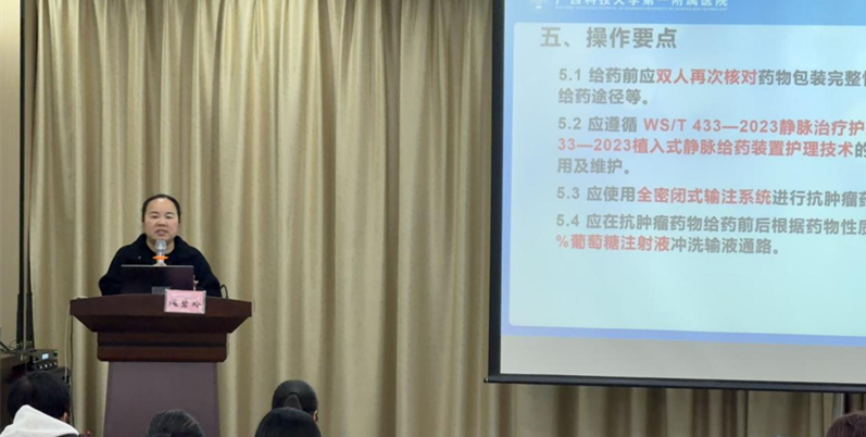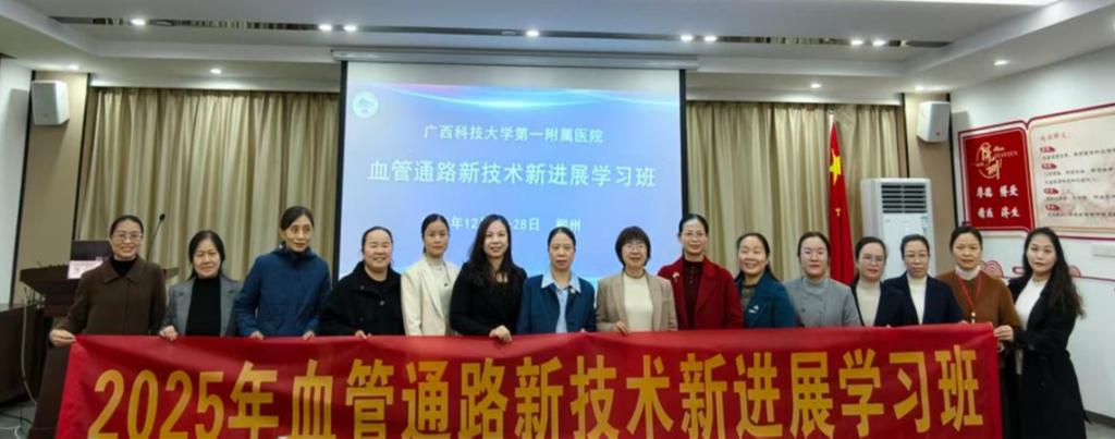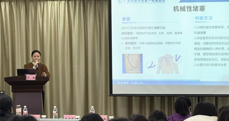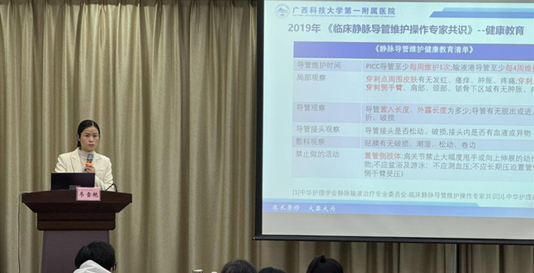 12月27-28日,由广西科技大学第一附属医院主办的血管通路新技术新进展学习班在医院党员活动室顺利举办。本次学习班有幸邀请到来自中华护理学会静脉输液专业委员会副主任委员、湖南省肿瘤医院护理部李旭英教授,广西护理学会静脉治疗专业委员会主任委员、广西医科大学附属肿瘤医院护理部执行主任雷奕教授,柳州市护理学会静脉治疗专业委员会主任委员、柳州市工人医院护理部张新臻教授等专家授课,来自区内各家医疗机构100多名护理骨干参加此次学术盛会。