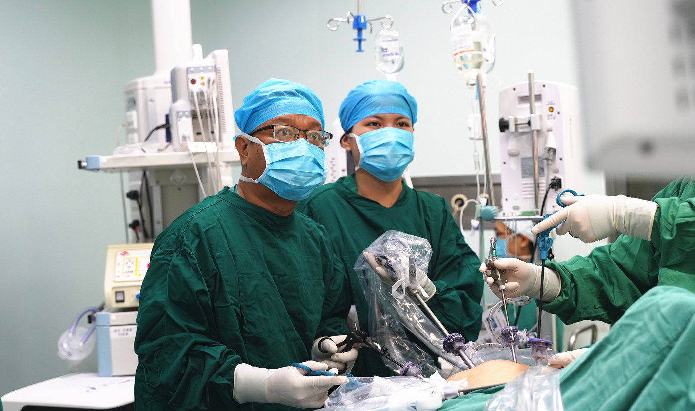 商志远主任正在为患者进行腔镜下肿瘤根治术