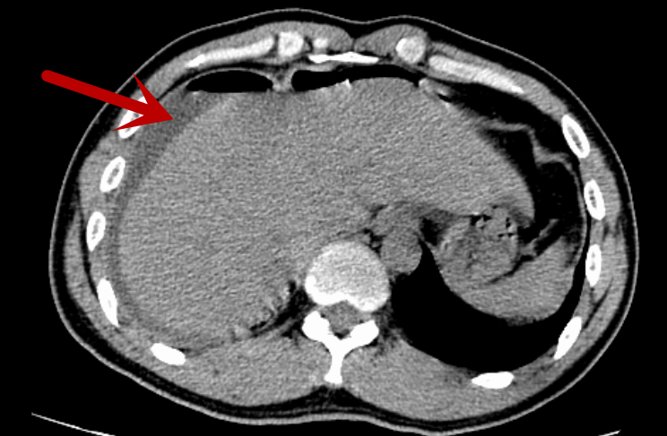 术前CT,箭头所指为阑尾肿胀伴有粪石
