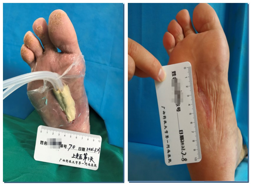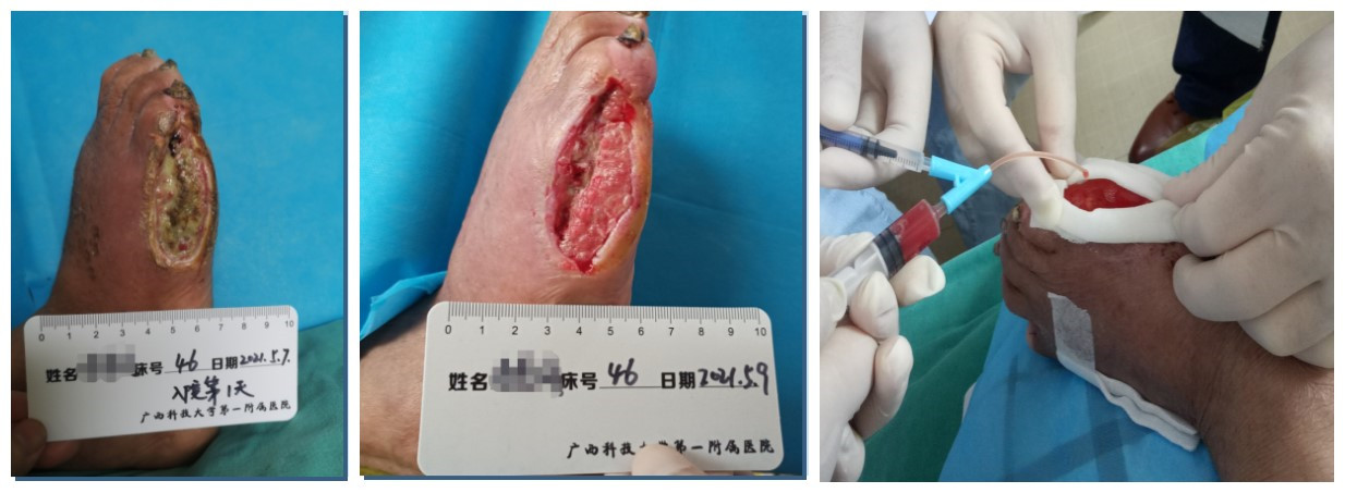 (2)难治性溃疡清创:科室多人曾赴四川大学华西医院糖尿病足诊疗中心、北京积水潭医院及广西医科大学附属医院进修学习,具备丰富清创经验,拥有国际认证的伤口治疗师。