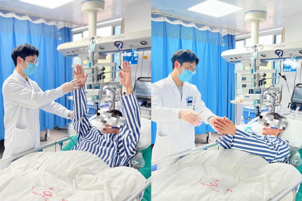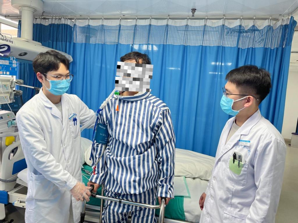 经过多科精心治疗与严密监测,患者感染得到控制,呼吸功能显著改善,复查CT颈部肿胀较前消退,气道压迫表现较前明显缓解,达到安全拔除气管插管的标准。当李伯成功脱离呼吸机,恢复自主呼吸的那一刻,标志着治疗取得了阶段性重大胜利。拔管第二天,李伯在呼吸与危重症医学科主管医师周世全和康复科治疗师莫兆财专业指导下便可在床旁活动。这不仅同步指导患者进行基础呼吸功能训练,还可以加速呼吸功能恢复,循环地进行了体能训练。