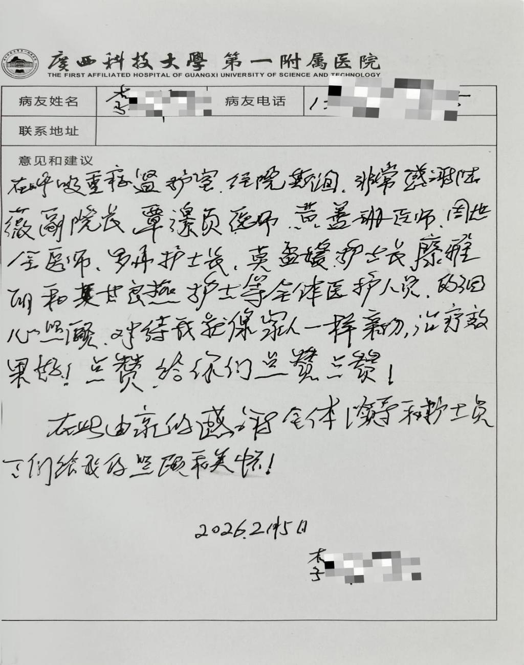 在多学科医护团队的专业救治与精细照护下,患者未出现任何术后并发症,生命体征平稳,左侧颈部疼痛症状完全消失,已能正常平卧休息。患者对我院多学科协作的高效响应、呼吸与危重症医学科的专业救治能力及护理团队的贴心照护给予高度认可与诚挚感谢。