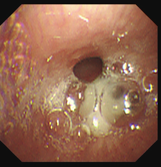 纤支镜下:右下叶前基底段支气管异物堵塞