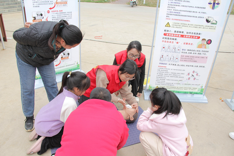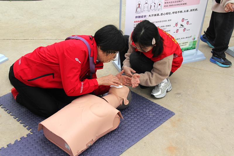 志愿者为居民讲解人工呼吸操作要点