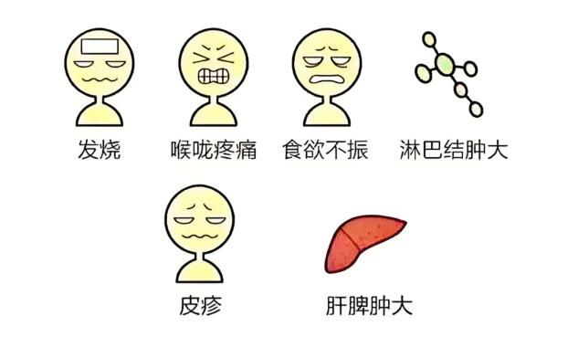 “亲吻病”一旦发作起来,症状跟普通感冒、流感的症状很相似,但对比起来,“亲吻病”还是有特点的,典型患者具有发热、咽峡炎和颈部淋巴结肿大三联征,可伴有肝脾肿大或皮疹。当孩子同时出现以下症状时,就要警惕是否感染了EB病毒:1、发烧持续不退,青少年体温多在39℃左右浮动,婴幼儿可能表现为低热。发热持续一周左右,有的孩子可能持续发烧10多天。2、咽痛、扁桃体充血水肿,扁桃体上可能会出现溃疡或假膜。3、双侧颈部淋巴结肿大,可能伴有疼痛,消退缓慢。4、约20%的患儿可出现肝脏肿大,肝区压痛,比较类似肝炎的症状。约10%的患儿皮肤可能出现皮疹,部分患儿可伴有呕吐。