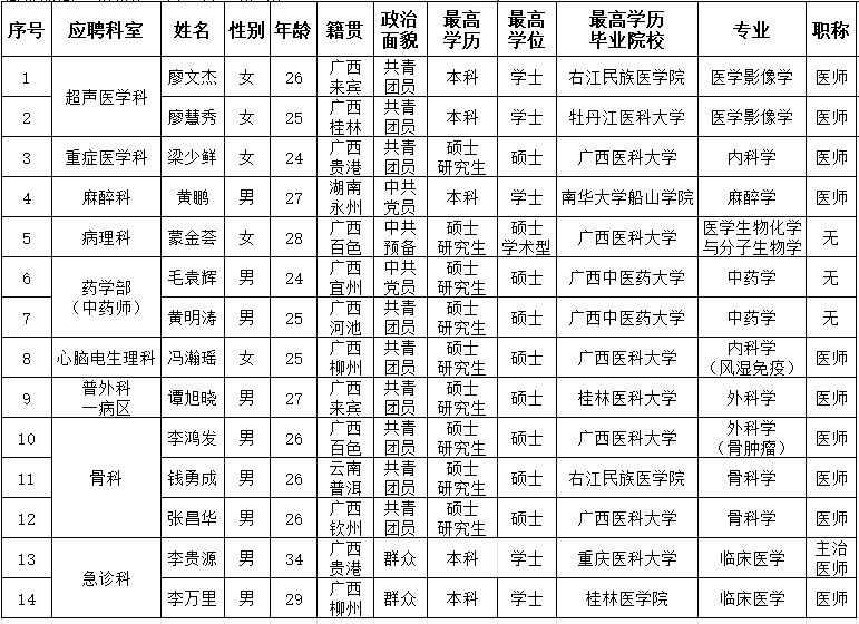 根据医院人员招聘制度,应聘我院临床医疗、医技岗位的廖文杰等14位同志通过医院面试、考核合格。经研究决定,同意确定廖文杰等14位同志为拟聘用人员,现予以公示五个工作日,公示时间从2025年12月2日至2025年12月8日。对公示内容如有异议,请以书面形式,并署真实姓名和联系地址,于2025年12月 8日前投至公示栏旁意见箱,或邮寄、直接送至人事科。地址:柳州市跃进路126号实验综合楼二楼人事科,联系电话:0772-2514419。